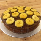Soft moist banana cake topped with slices of bananas caramelized in Gula Melaka butterscotch & liberally glazed!
