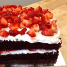 Alternate layers of fresh strawberries and light chocolate sponge.